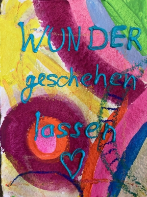 Die zu grundierende Farbe wird selbst entschieden und aufgetragen, die darauf entstehenden farbigen Muster, Motive werden selbst , von mir und weiteren Kursteilnehmern bemalt. Über die Intuitionsbemalung von mir zu dir werden heilsame Prozesse eingeleitet und liebevoll begleitet(siehe auch die Heilkraft der Farbe).